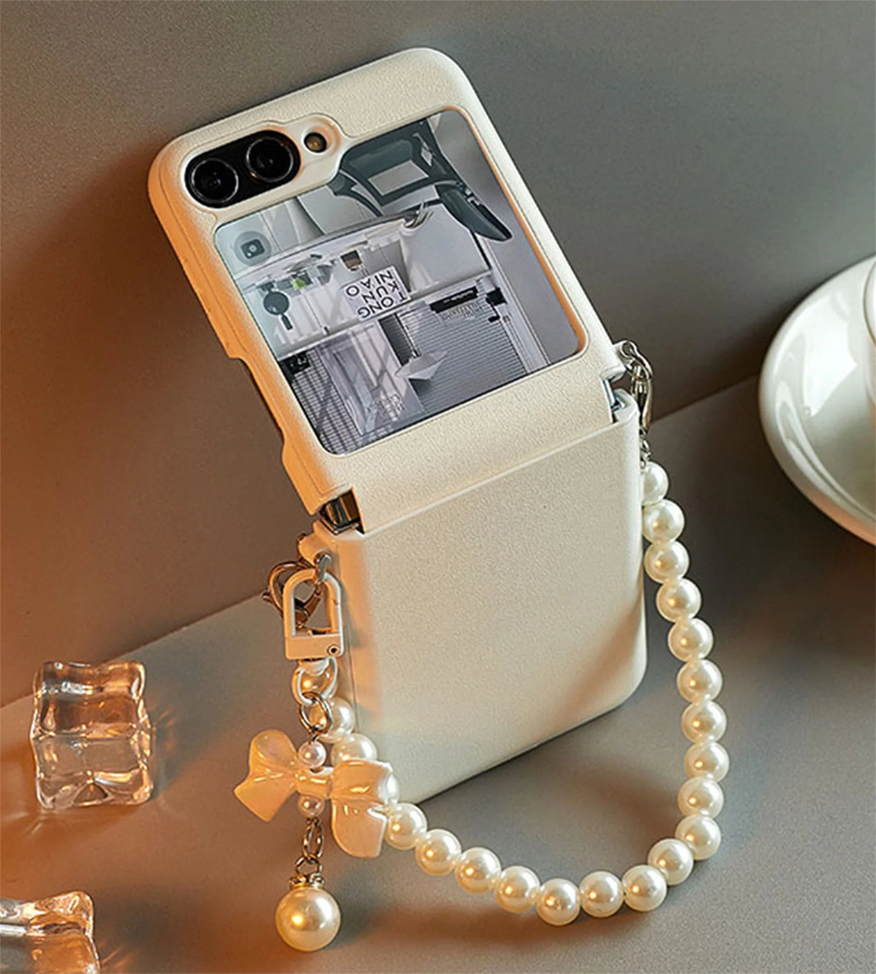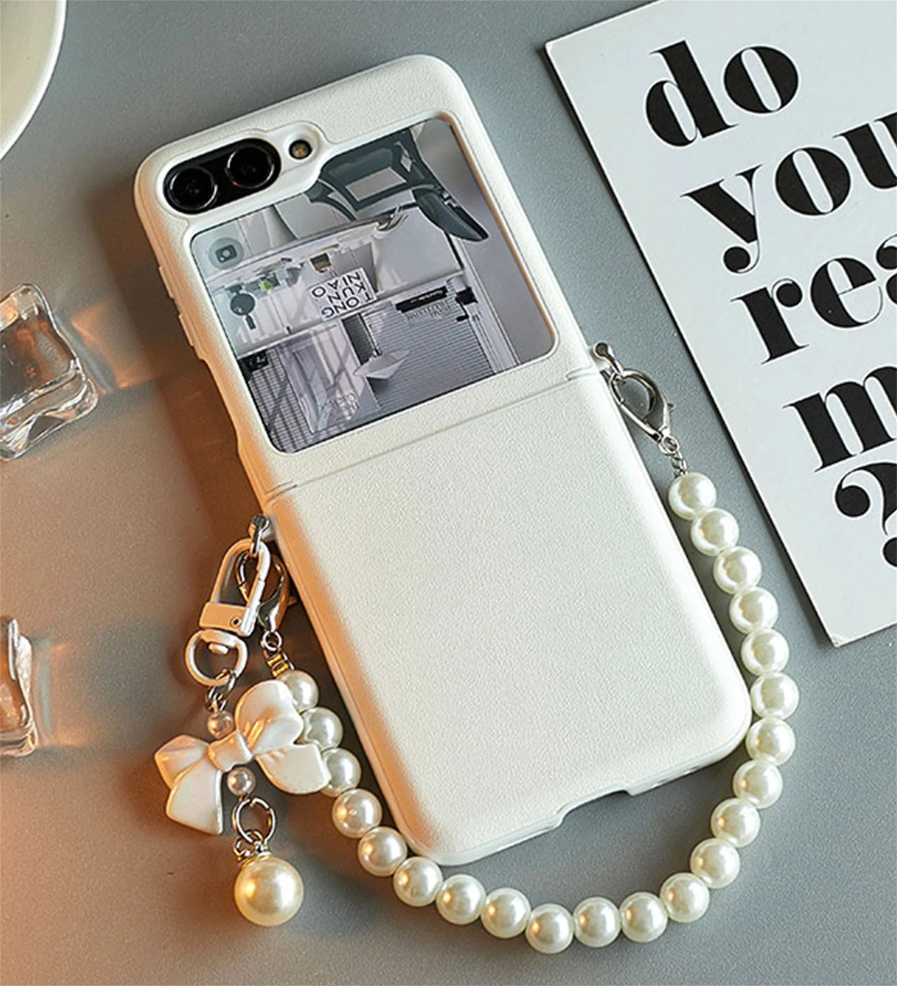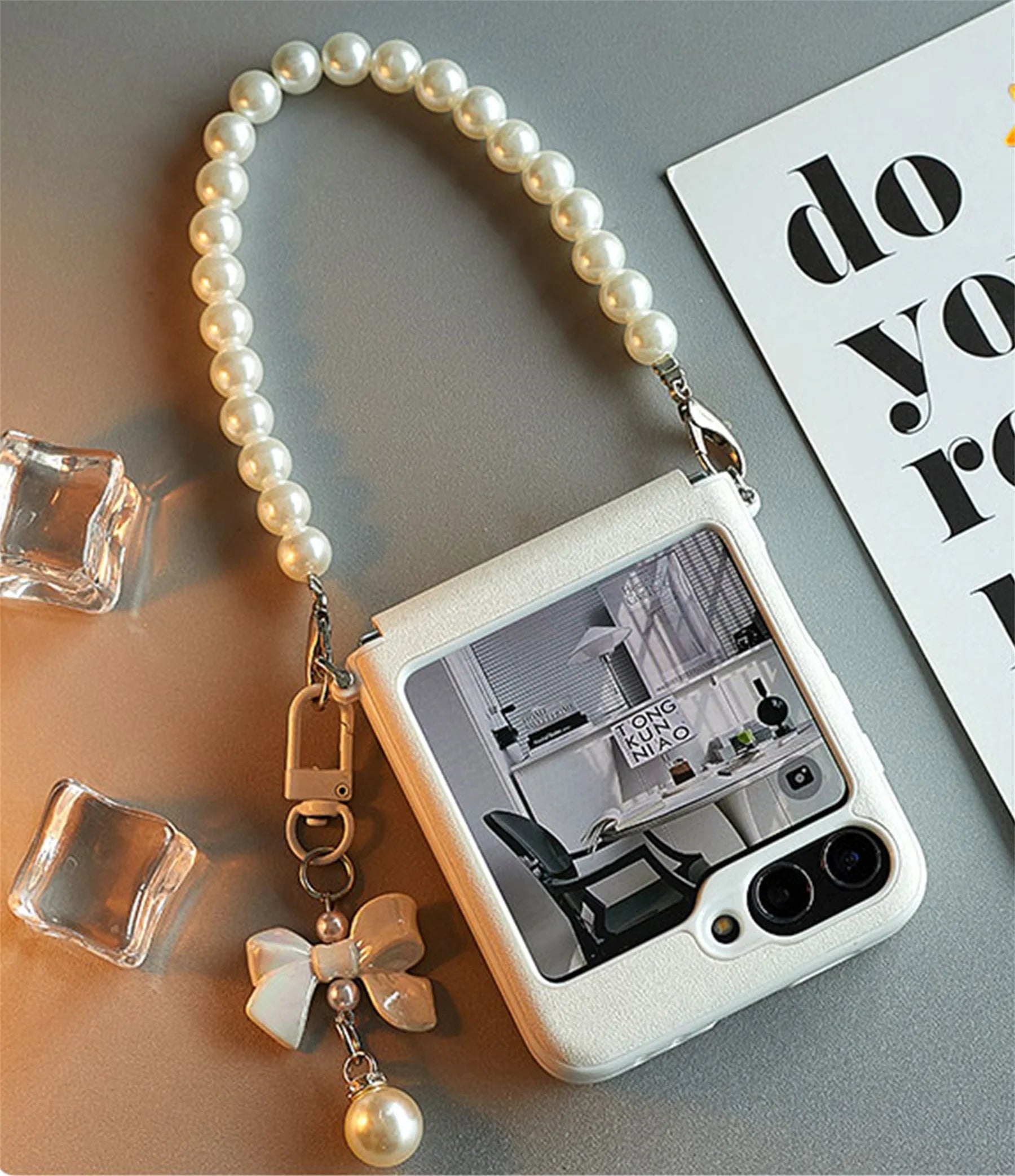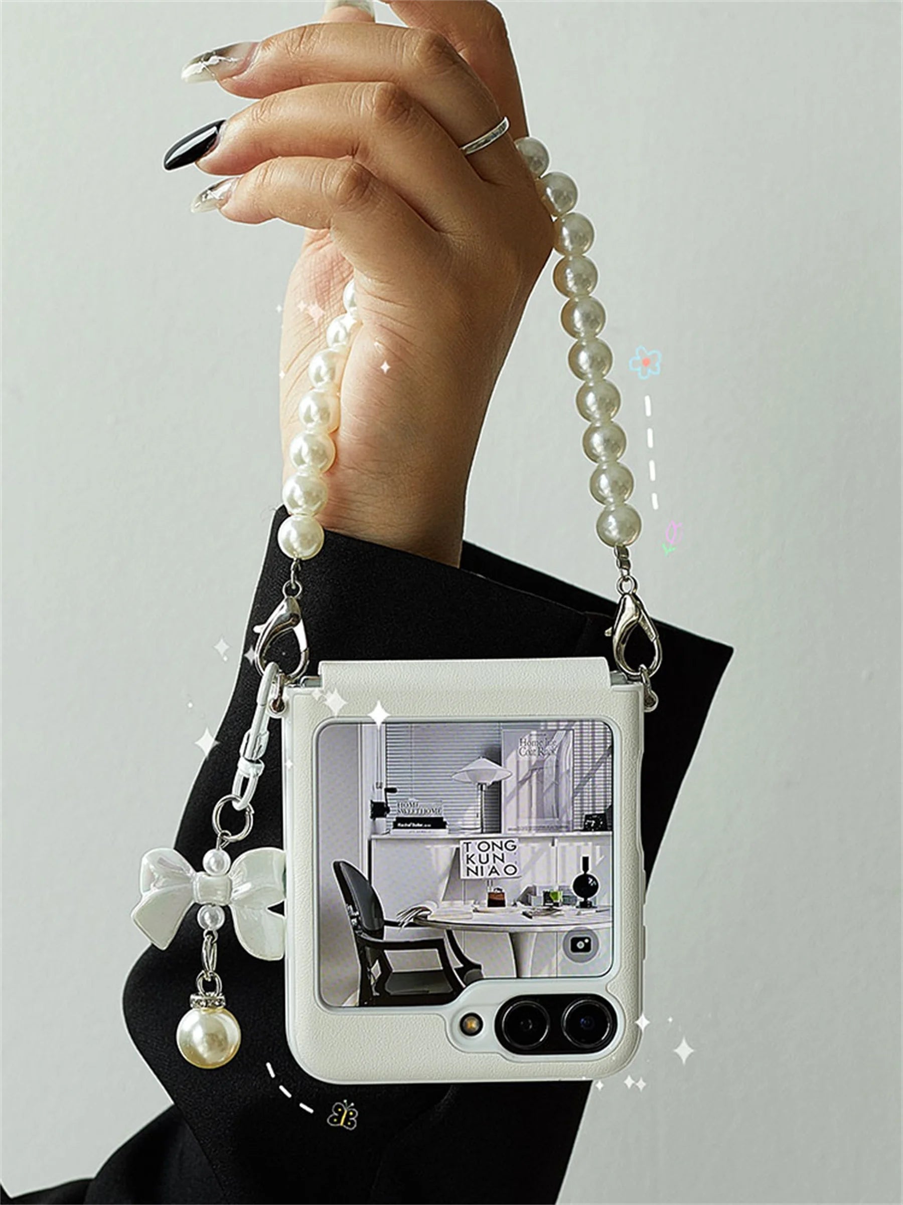 Korean ins Retro White Bow Pendant Pearl Bracelet Phone Case for Galaxy Z Flip